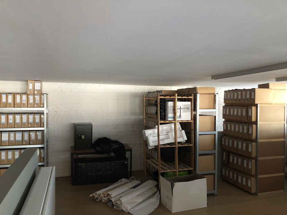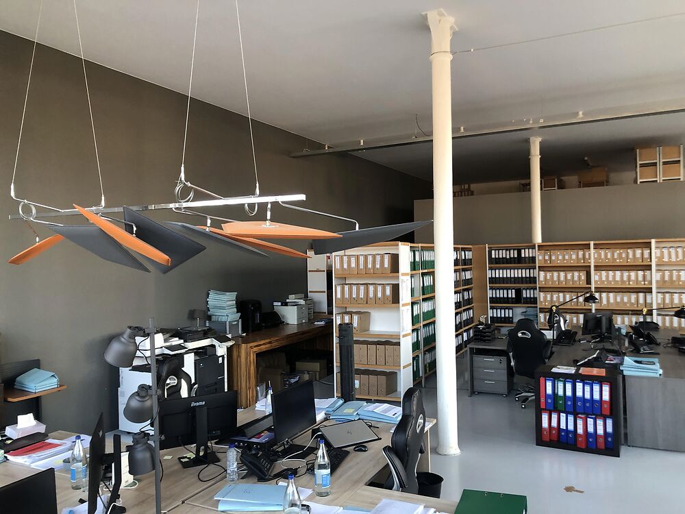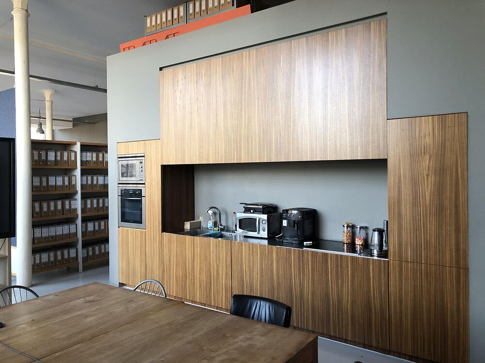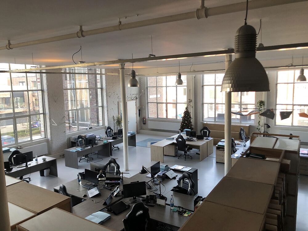 Deze kantoorruimte van 253m² omvat een ruime landscape kantoorruimte, open sociale ruimte met kitchenette, badkamer met dubbele wastafel en ligbad, apart toilet, archief -en technische ruimte en een mezzanine van 37m² boven het kantoor, en een aanpalend terras.